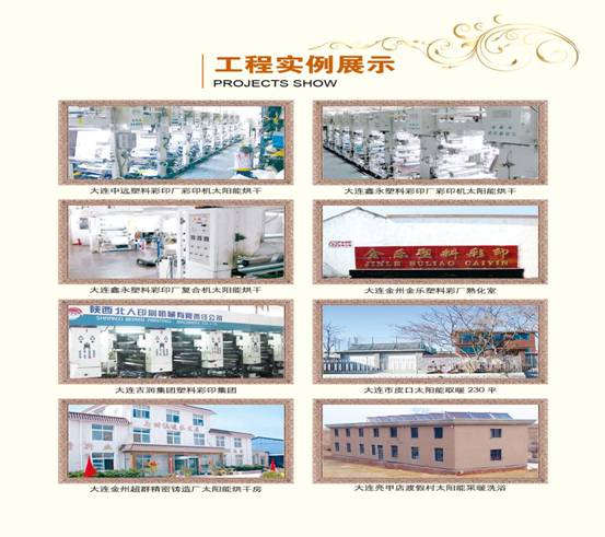 幾年來,我公司已經(jīng)為大連吉潤塑料彩印集團、大連中遠塑料彩印廠、大連鑫永塑料彩印廠、大連金州金樂塑料廠、大連中源塑料制品有限公司、南京索特包裝制品有限公司等包裝企業(yè)在印刷機、復合機設(shè)備及熟化室的烘干系統(tǒng)安裝了太陽能。通過安裝這套系統(tǒng),可以確保熟化恒溫達到50~55℃。不但節(jié)能減排效果明顯,實現(xiàn)了環(huán)境無污染,而且降低成本,節(jié)約能源達60%以上,受到企業(yè)普遍歡迎。
