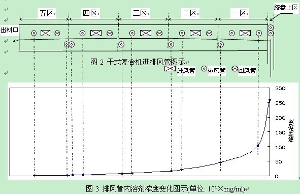 干燥烘箱分三段工作:蒸發區、硬化區和排除異味區。現在的中高檔干式復合機的烘箱干燥設計一般分為三段、四段或五段烘箱。下面以某五段烘箱的干式復合機中排風管內空氣的濃度變化趨勢,分析一下干式復合機的干燥過程。