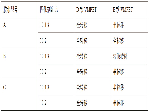 實驗中我們發現不合格品基本上都是固化不良引起,以為簡單的加大固化劑配比就可以了,但實際上這個點不易把控,一不小心就容易鍍鋁轉移而沒有強度了。雖然有C款膠水可以選擇,但這與我們在機臺設置上密切配合是分不開的。由表可看出: