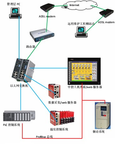 本系統舍棄了 Modem 撥號方式的遠程連接模式,而采用了基于ADSL網絡的遠程維護系統。廠家不僅能對 PLC程序也可以對人機界面和溫控模塊的程序進行遠程更新和維護,大大提高了檢修的速度和方便程度。