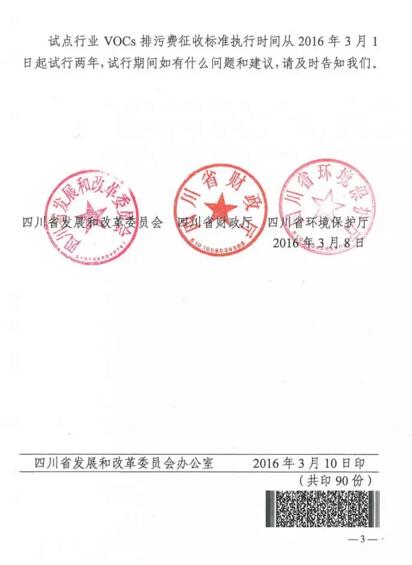 近日,繼北京市、上海市、江蘇省、安徽省和湖南省開征揮發性有機物VOCs排污費之后,四川省成為全國第六個省份、正式發布文件通知試點開征VOCs排污費,從2016年3月1日起執行。