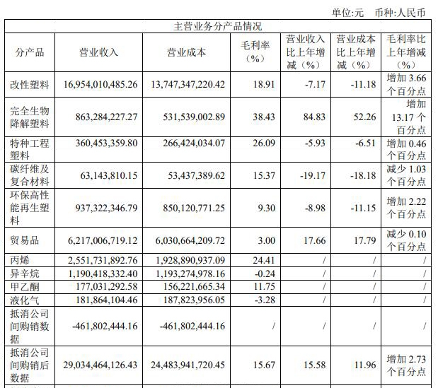備注:以上抵消數(shù)據(jù)為各產(chǎn)品分類間的抵消;完全生物降解塑料數(shù)據(jù)為珠海萬通的經(jīng)營數(shù)據(jù);特種工程塑料數(shù)據(jù)為特塑公司的經(jīng)營數(shù)據(jù);丙烯、異辛烷、甲乙酮、液化氣數(shù)據(jù)為2019年6-12月數(shù)據(jù)。