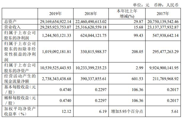 2019年,實現(xiàn)營業(yè)收入292.86億元,同比增長15.68%,實現(xiàn)歸屬于上市公司股東的凈利潤12.45億元,同比增長99.43%,歸屬于上市公司股東的扣除非經(jīng)常性損益的凈利潤10.19億元,同比增長208.05%,基本每股收益為0.4740元,同比增長106.36%,加權(quán)平均凈資產(chǎn)收益率12.12%,同比增加5.93個百分點。公司經(jīng)營活動產(chǎn)生的現(xiàn)金流量凈額為27.38億元,公司資產(chǎn)總額為291.70億元,負債總額為184.63億元,歸屬于母公司所有者權(quán)益總計105.40億元,資產(chǎn)負債率為63.30%。