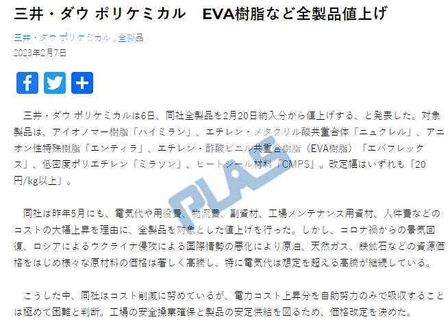 2月7日,三井陶氏化學(xué)公司宣布,自2月20日起提高公司EVA樹脂等全部產(chǎn)品價(jià)格,漲幅為20日元/kg(約合人民幣1027元/噸)以上。
