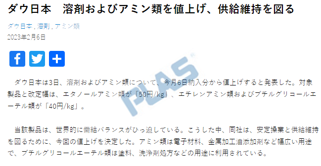 公司在通知中表示本次漲價(jià)原因主要是因?yàn)榘娰M(fèi)、使用費(fèi)、物流費(fèi)、輔材料費(fèi)、工廠維修費(fèi)、人工費(fèi)等在內(nèi)的成本大幅上漲,尤其是電費(fèi)超出預(yù)想的價(jià)格持續(xù)高漲。 2月3日,陶氏日本宣布溶劑及胺類產(chǎn)品漲價(jià),自2月6日起,乙醇胺類漲50日元/kg(約合人民幣2567元/噸)、乙烯胺類和丁二醇醚類產(chǎn)品漲40日元/kg(約合人民幣2054元/噸)。