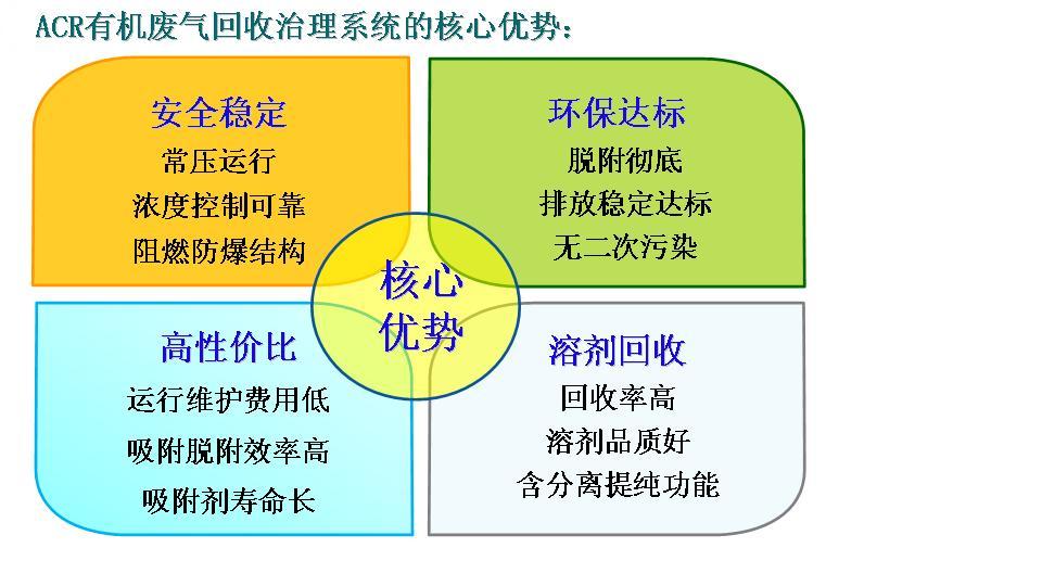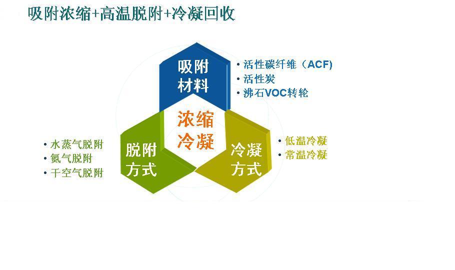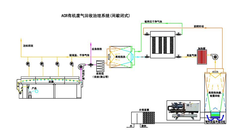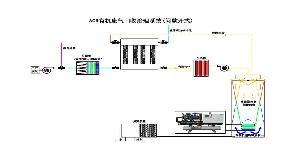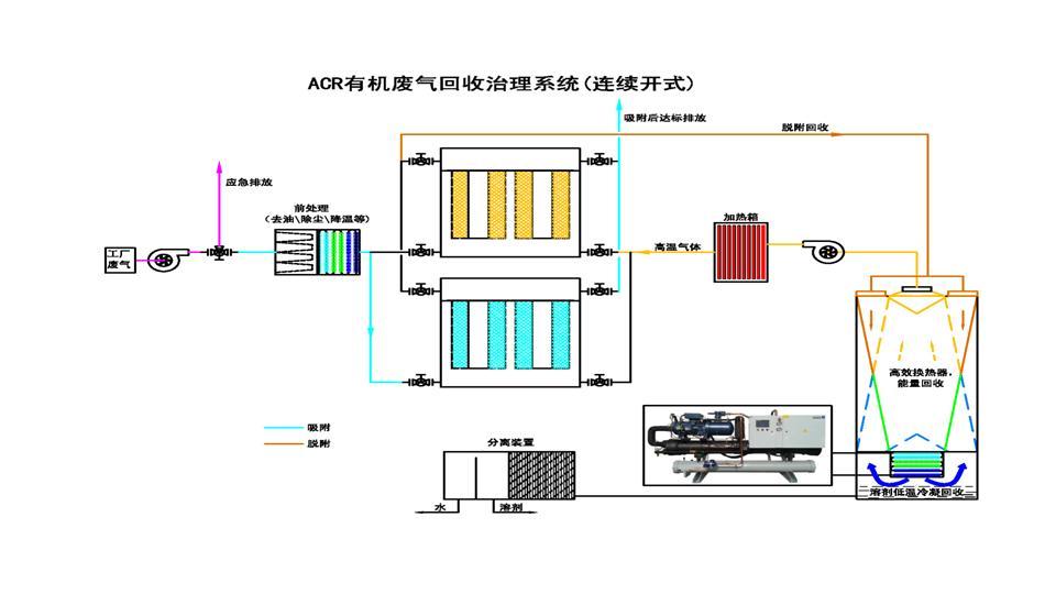 針對大風量、中低濃度的有機廢氣的處理采用ACR有機廢氣回收治理系統 我司自主研發的“ACR有機廢氣回收治理系統”由前級處理裝置、ACF(活性碳纖維)吸附裝置、脫附回收裝置、回收溶劑槽構成,前級處理通常包含降溫、除塵模塊,提升ACF的吸附能力,降低廢氣中塵埃沉積在ACF中的速度,延長ACF的使用壽命。ACF吸附裝置包含吸附器、切換閥門和連接管道。脫附回收裝置包含脫附控溫器、回收分離器、冷凍機組。 對于車間24小時連續作業、廢氣連續產生的常規情況,“ACR有機廢氣回收治理系統”采用多活性炭纖維吸附塔交替運作:車間排放廢氣經前級處理降溫、除塵后,經閥門通過其中一個吸附器,廢氣中VOCs被ACF的微孔吸附,經吸附處理后的廢氣達到排放標準后排放。經吸附處理后的廢氣達到排放標準后排放,排放出來的較低溫、干凈的氣體與客戶設備排出的高溫廢氣通過高效換熱器得到較高溫的氣體重新回到烘箱,熱能得以回收。另一吸附器經閥門連接到脫附回收裝置,脫附回收裝置產生的高溫熱空氣使ACF微孔中的VOCs脫附出來,隨空氣循環送回脫附回收裝置,經多級降溫后進入回收系統,在低于-30℃以下的低溫下被冷凝成液體得以回收。經冷凝回收后的空氣再經多級升溫后循環進入吸附器進行脫附。脫附結束后,脫附回收裝置送出冷空氣對吸附器進行降溫,降溫完成后通過閥門切換到吸附狀態,同時另一吸附器也被切換進入脫附狀態,如此循環往復連續工作,實現有機溶劑回收及廢氣達標排放。 對于車間非連續作業、廢氣間歇產生的情況,“ACR有機廢氣回收治理系統”可以采取單個活性炭纖維吸附塔在生產期間吸附、生產間歇期脫附的運作模式,可以降低設備一次性投入以及日常運行成本。 ???? ? 治理方案一: ? 治理方案二: